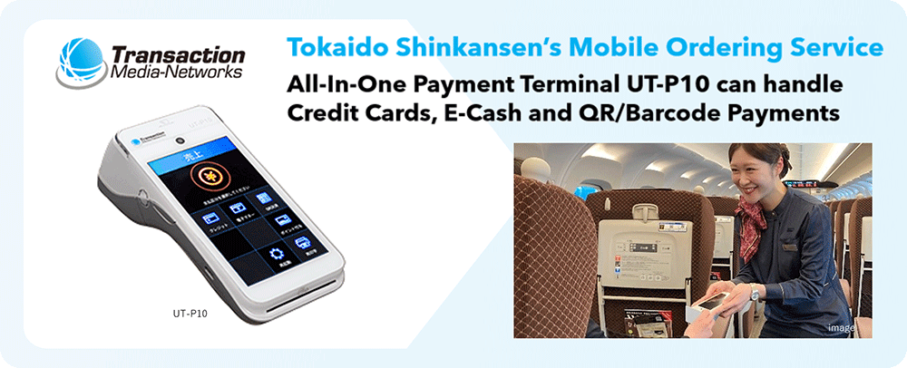 Transaction Media Networks, Inc. (TMN) announced that the Tokaido Shinkansen Mobile Order Service operated by JR Central Retailing Plus Co., Ltd. (JR-PLUS) has adopted TMN’s UT-P10 mobile payment terminal and the payment gateway service. As a result, credit cards, e-cash, and QR/barcode payments will be available to pay for snacks and beverages purchased on the Tokaido Shinkansen’s Nozomi and Hikari Green Cars.