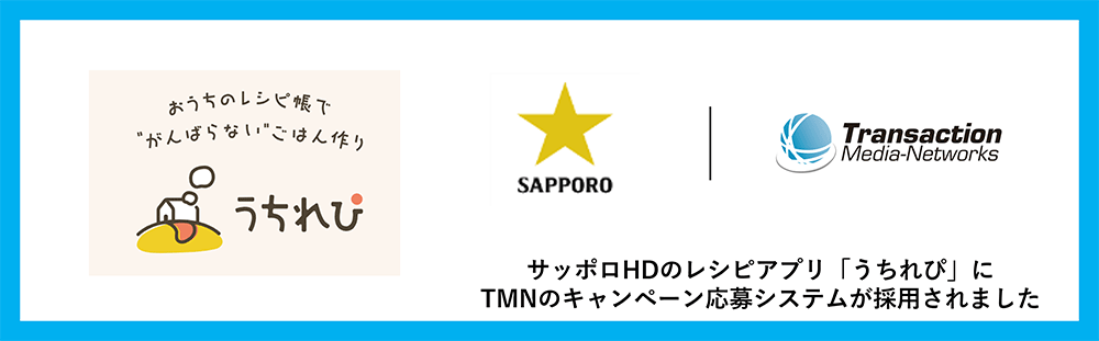 株式会社トランザクション・メディア・ネットワークス(本社:東京都中央区、代表:大高 敦、以下TMN)は、サッポロホールディングス株式会社(本社:東京都渋谷区、代表取締役社長:時松 浩、以下 サッポロHD)が運営するアプリサービス「うちれぴ」にTMNの「キャンペーン応募システム」が採用されたことをお知らせします。